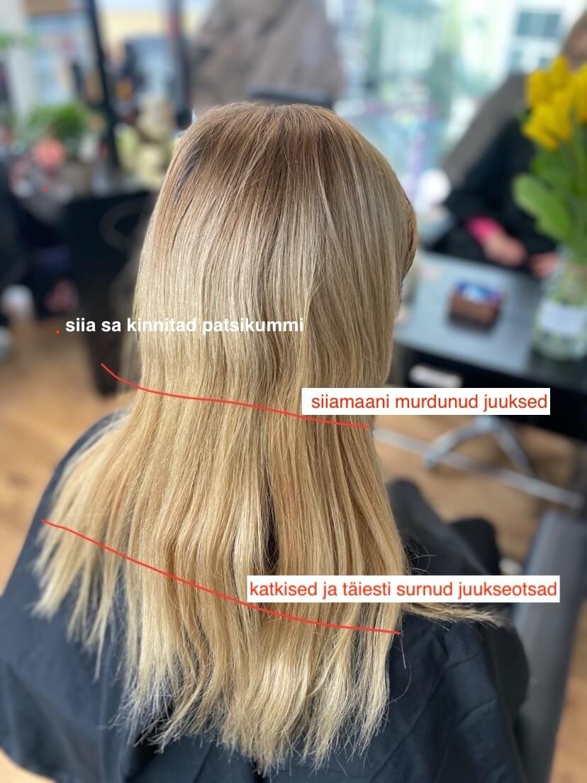 Kõige tavalisem süüdlane võib olla patsikumm. Kes üldse tuleb selle peale, et patsikumm võiks olla juuste murdumises süüdi?! Sama koht peas, sama pinge, päevast päeva. Juuksekarv väsib, muutub nõrgemaks ja lõpuks murdub. Olen seda ise kogenud lausa mitu korda ja näinud oma klientidel. Ma isegi ei hakka rääkima nendest kõrgetest hobusesabadest, mille lahti võtmisel jääb auk pähe. Juhtus minu kliendiga (teise juuksuri tehtud soengust), pilt on tõestuseks. ÕÕVASTAV!